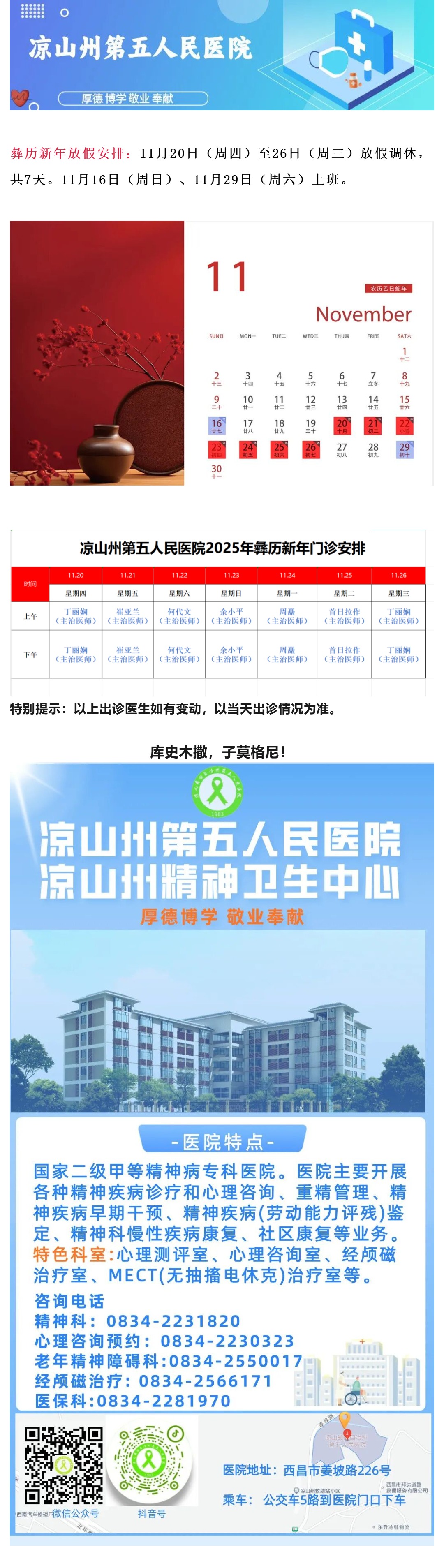 凉山彝族自治州第五人民医院(凉山彝族自治州精神卫生中心、凉山州优抚医院)于1983年经凉山州人民政府批准建立,隶属凉山州民政局,是州内唯一一所国家二级甲等精神病专科医院...