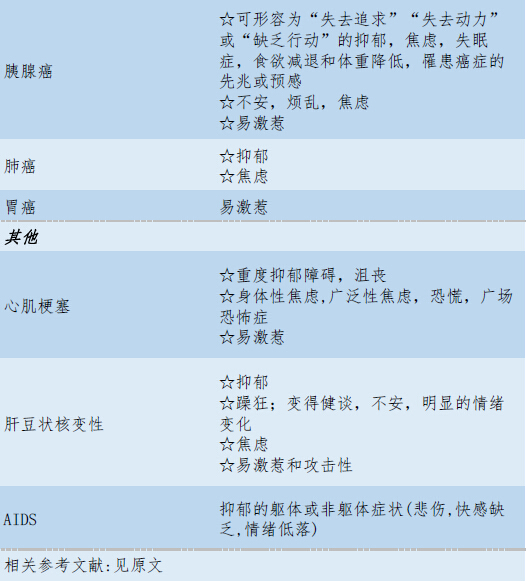 作为躯体疾病早期临床表现的情绪紊乱(抑郁、躁狂、焦虑、易激惹),总结如表1: