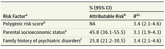 近期发表于《美国医学会杂志?精神病学》(JAMA Psychiatry)的一项研究,丹麦奥胡斯大学的研究人员分析了精神分裂症风险与多基因风险评分、父母社会经济地位、精神障碍家族史之间的关系;并且分析了是否家庭背景与个人遗传倾向相互作用导致特定亚组具有更强的风险倾向,以及先证者的基因可以何种程度的影响家族背景风险因素。