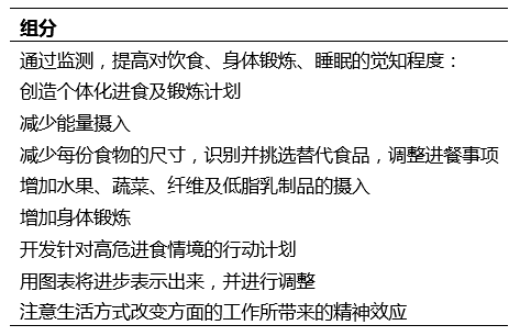 STRIDE干预建立在PREMIER生活方式干预、DASH食谱及心血管疾病高危个体肥胖治疗指南的基础之上。STRIDE干预模式的组分如下: