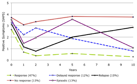★ 阳性症状呈现出5种不同的发展轨迹,分别为应答(47%)、延迟应答(12%)、复发(15%)、无应答(13%)及间断性应答(13%),如图1;