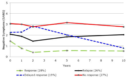 ★ 阴性症状呈现出4种不同的发展轨迹,分别为应答(28%)、延迟应答(19%)、复发(26%)及无应答(27%),如图2;