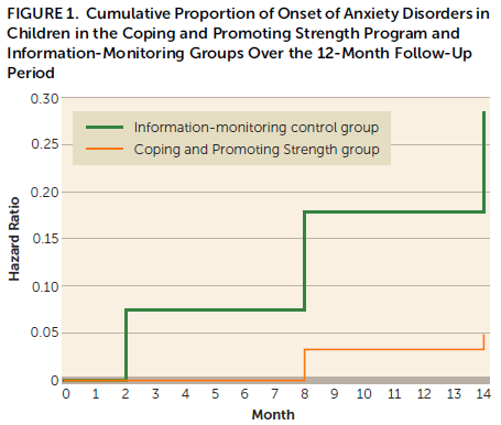作为对照组,信息监测组的受试者拿到了一个36页的小册子,内含焦虑障碍及相关治疗的知识,但并未包含活性干预组的相关治疗内容。相关评估由接受盲法设置的晤谈者所开展,实践为基线、干预结束(或随机化8周后)以及随访6及12个月。研究主要及次要转归分别为12个月时的焦虑障碍发病及焦虑症状严重度,测评工具为焦虑障碍晤谈表儿童版。