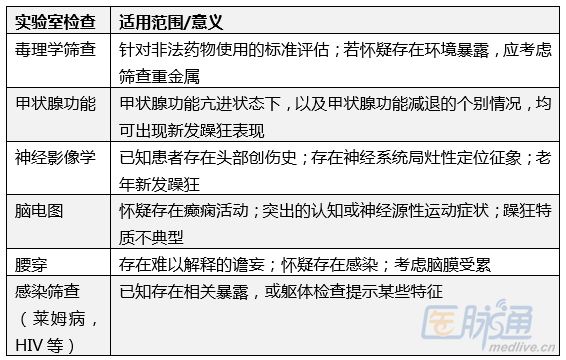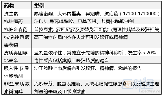 并非所有的躁狂初发均需要其他科室的协助,尤其是那些既往有抑郁史及临床/人口学特征高度接近新发双相障碍的患者。然而,基本评估仍是必要的,包括可能与患者精神状态异常相关的药物: