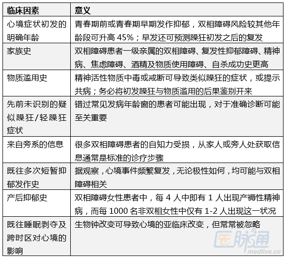很多抑郁特征,包括季节性抑郁、非典型抑郁、自杀倾向、易激惹、焦虑、共病物质使用障碍、产后心境事件发作、短暂但多次复发的抑郁,均与潜在的双相障碍相关,但没有一个能用于明确双相障碍诊断。来自NIMH协作抑郁研究的数据显示,当患者存在双相障碍家族史时,抗抑郁药相关心境转相后的复发躁狂/轻躁狂风险更高,而其他临床变量的预测价值则相对较低。