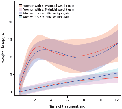 不同性别及短期体重增加受试者的中长期体重变化,阴影部分代表95%置信区间;蓝线及红线分别代表男性及女性