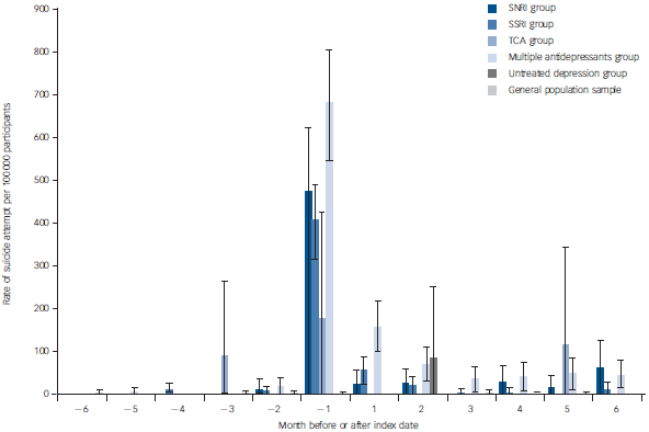 一项12月3日在线发表于《英国精神病学杂志》(IF 7.991)的研究中,来自美国的研究者探讨了使用不同种类抗抑郁药的抑郁患者、未治疗患者及一般人群的自杀未遂风险及时间特点。研究者采用回顾性倾向匹配设计,调取了1997-2007年间美国真实世界条件下的抑郁治疗数据,主要涉及SNRIs、SSRIs及TCAs。研究对象包括两个队列,其一为抑郁成人患者队列,包括药物治疗及未治疗者;另一个为一般人群。研究者将上述两个队列的自杀未遂风险进行了比较。