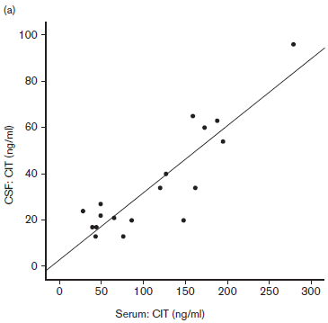 西酞普兰血药浓度(横轴)与CSF浓度(纵轴)之间的相关性(Paulzen M. et al. 2015)