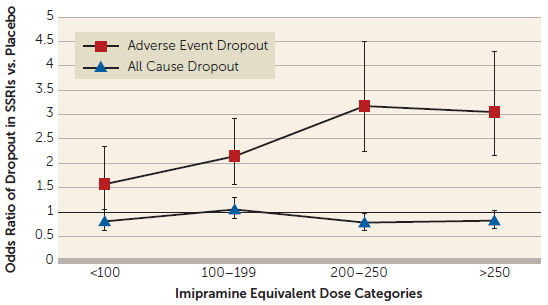 研究显示,与低剂量相比,高剂量SSRIs在治疗抑郁症时的疗效具有优势(产生应答的需治数为14-16),这一优势似乎在丙咪嗪250mg(等效于氟西汀50mg、帕罗西汀50mg、舍曲林300mg、西酞普兰83.3mg、艾司西酞普兰41.7mg)时到达平台期。另一方面,高剂量SSRIs可导致不良反应的增加(造成损害的需治数为22-24),但总体治疗脱落率不升反降,可能正是得益于其疗效优势。换言之,现行指南有关“疗效不佳时考虑加量”的建议可能是合理的。