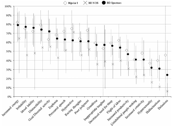 通过使用随机效应模型,研究者确定了横跨各种BD亚型的最常见的儿童躁狂症状,涉及BD障碍 I 型(BD-I)、BD未特定(BD-NOS)及BD谱系障碍。这些症状包括:精力增加(79%)、易激惹性升高(77%)、心境不稳定(76%)、随境转移(74%)、目标导向行为增加(72%)、欣快/心境高涨(64%)、言语迫促(63%)、多动(hyperactive,62%)、思维奔逸(61%)、判断力不佳(61%)、夸大(57%)、不适切的大笑(57%)、睡眠需求减少(56%)及思维跳跃(54%)。