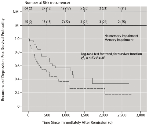 2004年4月至2012年3月期间,研究共纳入了110名满足DSM-IV-TR重性抑郁障碍(MDD)诊断标准、目前处于缓解期(汉密尔顿抑郁量表总分≤7)的患者,并对其进行了前瞻性的随访。根据抑郁缓解时是否残留记忆损害,受试者被分为两组,所使用的评估工具为Wechsler记忆量表修订版。研究者比较了两组受试者自基线时的缓解状态至抑郁复发(临床总体印象-抑郁严重度量表得分≥4)所经历的时间,并使用Kaplan-Meier生存曲线、生存时序检验及Cox比例风险比(HR)评估了缓解后记忆损害与复发风险的相关性。
